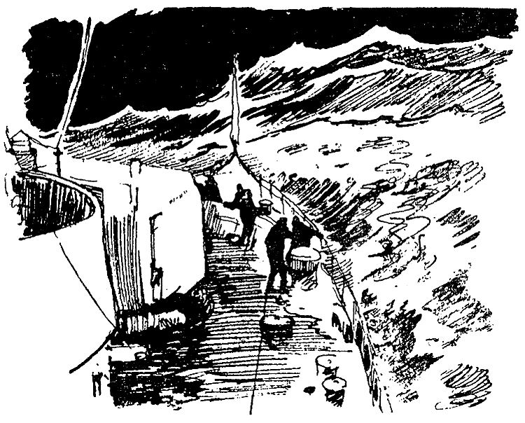 В кают-компании возникли свои сложности, кроме общих для всего корабля: как пообедать, не облившись супом, как поспать и не свалиться при этом с койки, как высушиться и согреться после четырех часов вахты.