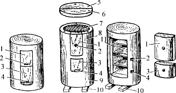 Рис. 1. Колоды: слева – типичная, в середине – улучшенная, справа – рамочная; 1 – верхняя должея; 2 – верхний леток; 3 – нижняя должея; 4 – нижний леток; 5 – крышка; 6 – гвозди, прикрепляющие крышку; 7 – линейка для наващивания сотов; 8 – голова колоды; 9 – пята колоды; 10 – брусья подставки; 11 – рамки