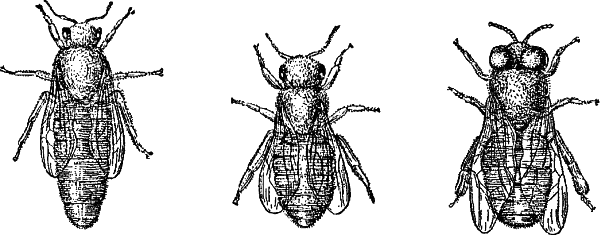 Рис. 3. Особи пчелиной семьи (слева направо): пчелиная матка, рабочая пчела, трутень