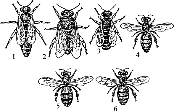 Рис. 4. Некоторые породы пчел: 1, 2, 3 – матка, трутень и рабочая пчела среднерусской породы; 4 – серая кавказская пчела; 5 – желтая кавказская пчела; 6 – итальянская пчела