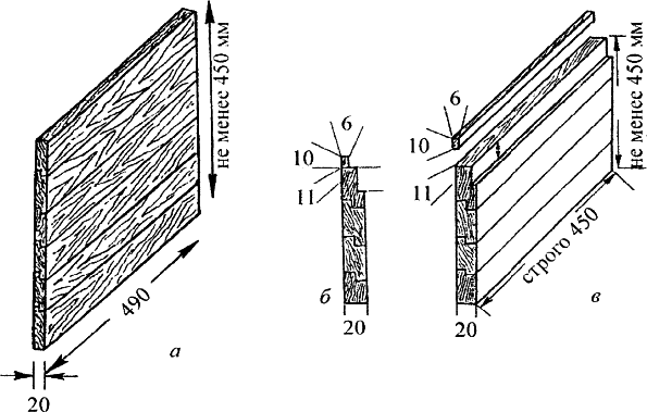 Для наиболее применяемого в наших условиях 12-рамочного улья размером 450 × 450 мм высота боковых стенок должна быть не менее 450 мм (можно чуть больше); их длина – 490 мм, если толщина досок, из которых составлены боковые стенки, не больше 20 мм. Отдельные дощечки с выбранными шпунтами соединяют в одну стенку деревянными или металлическими гвоздями, заостренными с обеих сторон, и шипами. В каждой дощечке надо выбрать фальц, чтобы не было щелей.