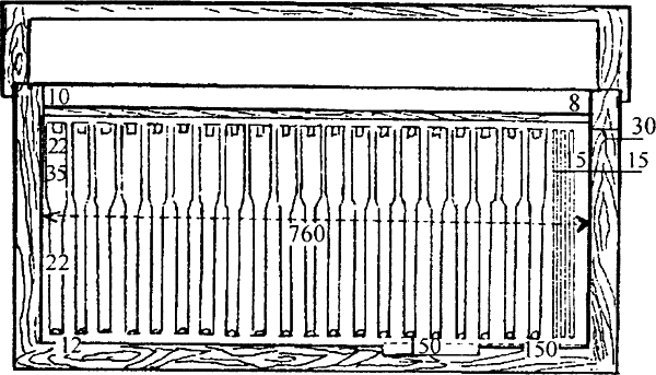 Рис. 9. Улей-лежак на 20 стандартных рамок (разрез)