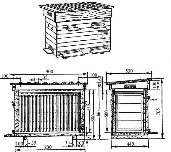 Рис. 10. Украинский улей: общий вид, продольный и поперечный разрезы