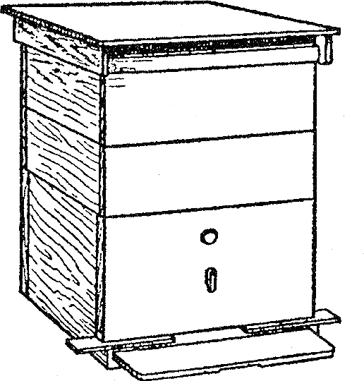 Украинский улей-лежакНа Украине часто встречается улей-лежак на повернутую набок стандартную рамку (300 × 435 мм) – он носит название украинского улья. Состоит из корпуса с глухим дном и односкатной крышей, 20 рамок и одной вставной доски. Внутренние размеры корпуса – 760 × 315 × 480 мм. Передняя и задняя стенки двойные, утепленные. Наружные стенки толщиной 15 мм, а внутренние – 25 мм. На передней стенке расположены по два летка – нижних (200 × 12 мм) и верхних (100 × 12 мм), прикрывающихся задвижками. Один нижний леток размером 100 × 12 мм сделан также на боковой стенке улья. Дно толщиной 35 мм стоит на опорных брусках и наглухо крепится к корпусу. Высота передней стенки обвязки крыши 120 мм, задней – 60 мм, ее толщина 25 мм. В боковых стенках обвязки сделаны вентиляционные пропилы. Иногда такие ульи бывают и с магазинными надставками.