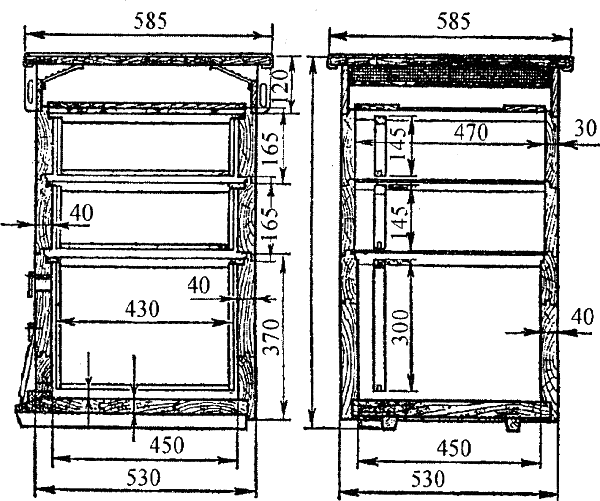 Подкрышник не отделяется от корпуса. Дно двойное, неотъемное. На передней стенке корпуса устроены летки в виде щели – верхний 100 × 10 мм и нижний 200 × 10 мм. Внутренние размеры корпуса 525 × 450 × 430 мм. Магазинные надставки две. Длина каждой 490 мм, ширина 450 мм и высота 15 мм. Толщина передней и задней стенок надставки 25 мм, а боковых – 20 мм. Крыша улья двускатная.