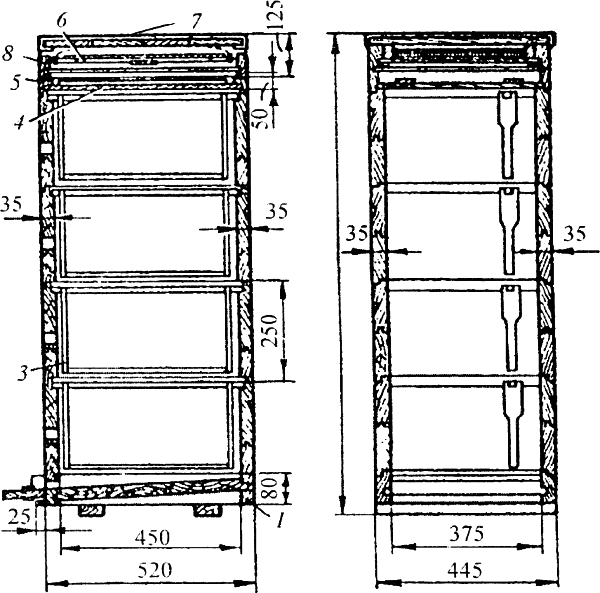 Рис. 11. Двенадцатирамочный одностенный улей на стандартную рамку с полунадставкой: продольный и поперечный разрезы