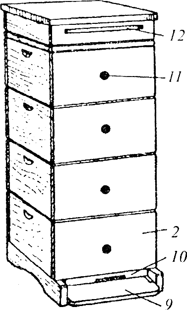 Многокорпусный улейМногокорпусный улей состоит из двух-трех и более корпусов, каждый из которых вмещает 10 рамок размером 435 × 230 мм (дадановская укороченная рамка). В районах с обильным медосбором используют 4–5 корпусов. Кроме корпусов для производства меда применяют магазинные полунадставки на 8–9 полурамок высотой 145 мм. Внутренние размеры корпуса – ширина 375 × 450 × 340 мм.