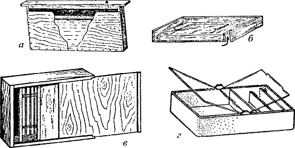 Рис. 24. Внутриульевые кормушки: а – кормушка-рамка; б – деревянная кормушка ящичного типа; в – кормушки надрамочные деревянные; г – кормушка надрамочная из пластмассы