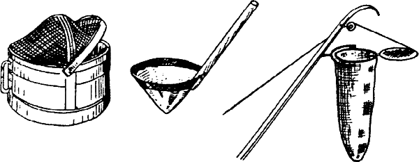 Рис. 25. Инвентарь, используемый при роении пчелиных семей: а – роевня Бутлерова; б – черпак для огребания роя; е – роесниматель