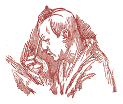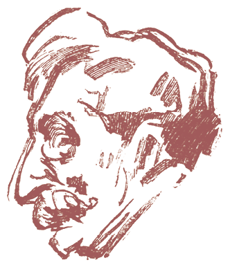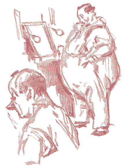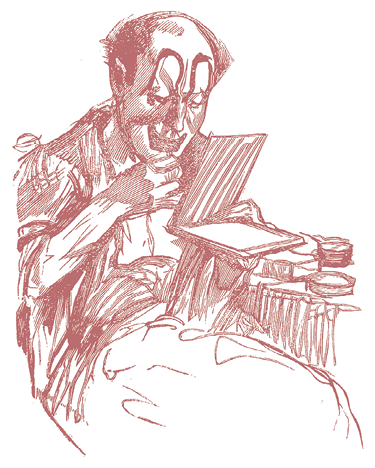 Альбер кладет сначала основной тон – розовую массу, которой он покрывает все лицо; потом мылом заклеивает брови, чтобы грим держался на них, и на этом фоне тщательно разрисовывает свое лицо для выхода. Губы покрываются черной краской, брови поднимаются до волос и соединяются большими белыми пятнами с глазами. Два мазка голубой краски отмечают глубокие морщины, и громадный красный нос (бесплатная реклама водки) дополняет слегка удивленное выражение лица замечтавшегося пьяницы. Он кладет пудру, чтобы держались краски, и для устранения излишнего блеска вытирает лицо мягким платком, строго следя за тем, чтобы не испортить свою трудную работу.