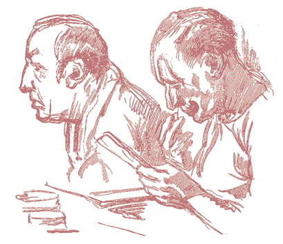Молодой человек, сидящий рядом с мнимым пьяницей, то краснеет, то бледнеет, когда сосед обращается к нему. Он охотно заплатил бы еще раз за свое место, если бы мог покинуть его, не возбуждая всеобщего внимания. Но это напряженное настроение сменяется общим смехом. Пьяница и недовольный им сосед оказываются артистами, и вся сцена была разыграна.