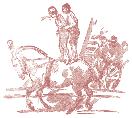 Будущие «скоморохи» изучают первооснову всей акробатики – вольтиж и «обезьяний» прыжок. Чтобы достигнуть в них совершенства, нужно работать несколько лет, и все же для многих детей они оказываются непреодолимой трудностью. Когда они оканчивают изучение этих упражнений и более сложных – сальто-мортале, «львиного» прыжка и т. п., – они переходят к танцам и усвоению правильной осанки. Потом наши друзья учились музыке, немного фокусам, а Франсуа, который впоследствии был одним из лучших наездников своего времени, учился верховой езде.
