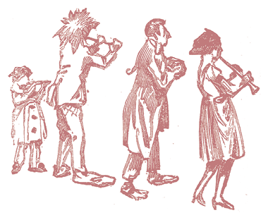 В 1922 году наши друзья были в Лондоне и забавлялись немецкими оркестрами, игравшими на всех углах венские мелодии. Комичным был не столько недостаток таланта, сколько желание, чтобы эту музыку принимали всерьез. В то же время в Лондон приехал оркестр Республиканской гвардии, и Фрателлини часто слушали его. Из сравнения двух этих зрелищ возникла у них мысль сделать пародию на оркестры. Они ее показали впервые в 1923 году, втроем, в обычных своих костюмах. Потом они присоединили Виктора и Анри и совершенно изменили костюмы. Позднее в сцене приняли участие и младшие дети в костюмах Пьеро и Луиза, дочь Альбера, игравшая на саксофоне или на скрипке.