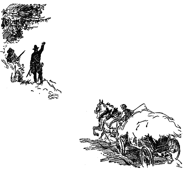 Две откормленные лошади легко вывезли воз на лесную дорогу: Пепу даже не нужно было их погонять. Но не успел воз выехать из лесу, как па дороге послышался лошадиный топот, и разъезд в синих мундирах выехал из-за деревьев.