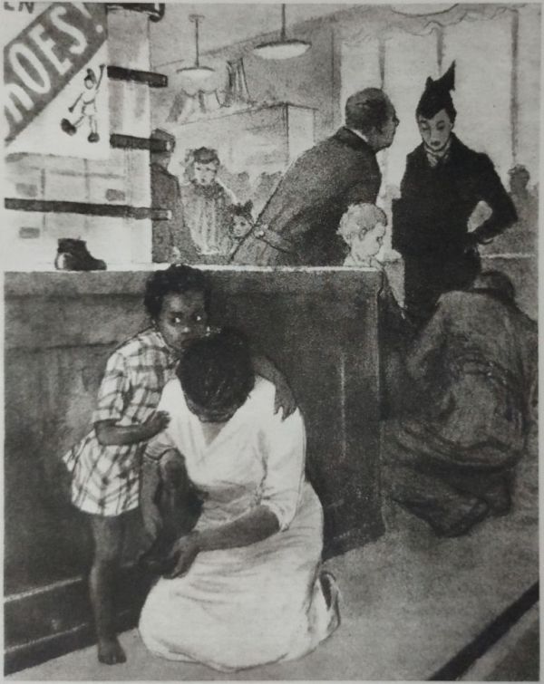 Они вошли в магазин. Один приказчик примерял жёлтые туфли белокурому курносому мальчику, другие преспокойно болтали. Высокий хозяин у конторки даже не оглянулся на негритянку с девочкой.