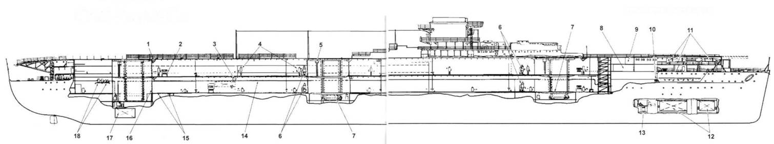 1 – устройство водяной завесы противопожарной шторы; 2 – пост заправки самолетов маслом; 3 – монорельс транспортировки боеприпасов; 4 – водонепроницаемые герметичные двери; 5 – пост управления самолетоподъемником; 6 – агрегаты системы обогрева ангаров; 7– платформы самолетоподъемников; 8 – авиаремонтная мастерская; 9 – шахта для спуска авиационных двигателей; 10 – пост приема авиационного топлива; 11 – баллоны со сжатым воздухом; 12 – резервуары хранения авиационного топлива; 13 – резервуар хранения сжатого газа; 14 – трубопровод магистрали подачи авиационного то л ива; 15 – подъемники авиационного боезапаса; 16 – противопожарная перегородка; 17 – хранилище авиационного топлива; 18 – фильтры очистки авиационного топлива