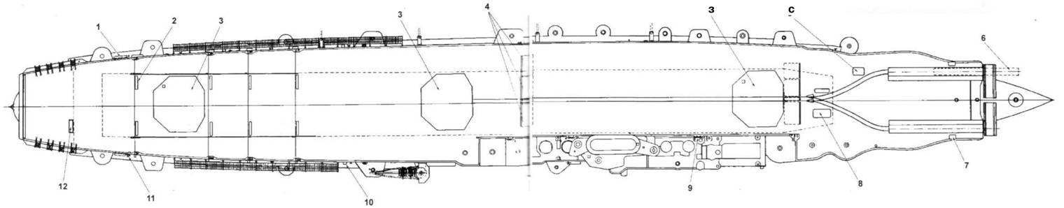 1 – пост управления сбросом глубинных бомб; 2 – плафон подсветки тросов аэрофинишера; 3 – самолетоподъемники; 4 – подъемные отбойные щиты; 5 – люк шахты спуска авиационных двигателей; 6 – выдвижная ферма катапульты; 7 – пост управления катапультой; 8 – люк спуска стартовых тележек; 9 – топливная раздаточная колонка; 10 – наблюдательный пункт аэрофинишера; 11 – противопожарный пост; 12 – кормовой подъемник авиационных боеприпасов