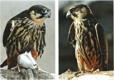 Самка окрашена значительно бледнее – охристорыжая с серо-полосатой спиной, крыльями, хвостом и продольными пестринами на брюхе. Так же как и у пустельги, у кобчика есть черные «усы».