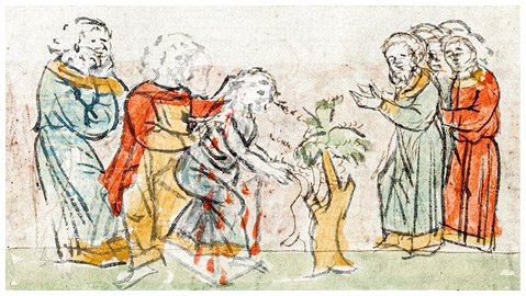 Расправа волхвов-ярославцев в голодное время в Ростовской земле со знатными женщинами. Библиотека Российской академии наук. Санкт-Петербург, Россия, конец XV в. (ок. 1490) (ФГБУ Библиотека Российской академии наук.)