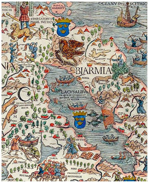 Биармия на Carta Marina. Работа Олауса Магнуса. Уппсальский университет, Картографическая коллекция. Уппсала, Швеция, 1539 г. (Wikimedia Commons.)