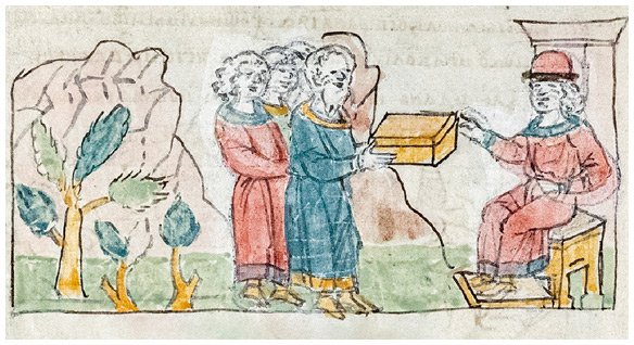 Приношение вятичами дани Святославу Игоревичу. Миниатюра из Радзивиловской летописи. Библиотека Академии наук. Санкт-Петербург, Россия, конец XV в.