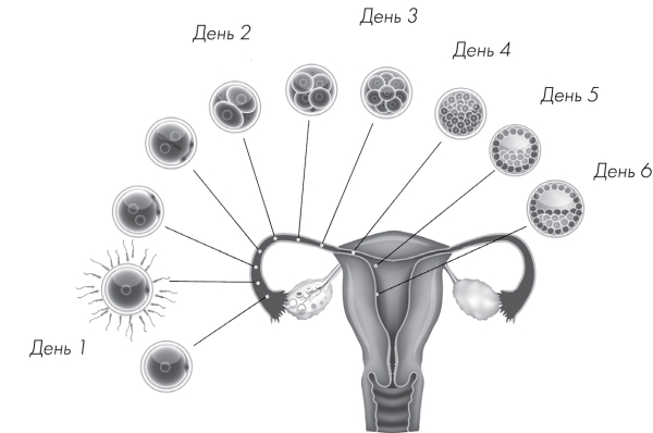Так, непрерывно делясь, клеточная масса в течение двух дней продвигается по маточной трубе. Реснички, выстилающие внутреннюю поверхность фаллопиевых труб, колеблются, подобно водорослям, подталкивая морулу ко входу в матку, а мышечные сокращения (вызываемые определенным соотношением между концентрациями в крови будущей матери прогестерона и эстрогенов) и ток жидкости внутри трубы помогает им в этом.
