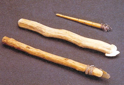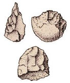 Со временем человек научился изготавливать более совершенные орудия труда. На смену заостренному камню пришли кремневые рубила, ножи, скребки, проколки. Рубило, привязанное сухожилиями животных к крепкой рукояти, служило в качестве топора. Ножами можно было снимать и резать шкуры. Их очищали скребками, а затем проколками проделывали по краям шкур отверстия и сшивали сухожилиями. Получалась грубая, но теплая одежда. Человек изобрел также копье с каменным наконечником. С ним было легче охотиться и обороняться от хищников.