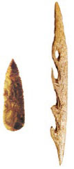 Каменный наконечник стрелы и костяной гарпун для рыбной ловли