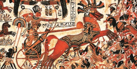 В войске фараона были также воины, сражавшиеся на боевых колесницах. Они составляли ударную силу армии. На каждой колеснице размещалось по два воина. Один правил лошадьми и прикрывал щитом другого, который стрелял из лука и бросал в противников короткие копья – дротики.