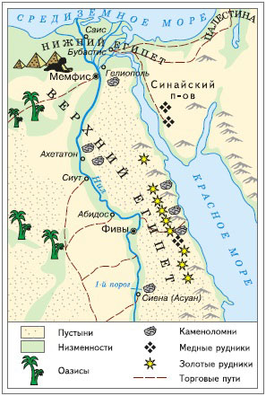 В древности на территории Египта существовало около сорока номов. Их правители стремились подчинить соседей и захватить побольше плодородных земель. После длительной борьбы все номы дельты Египта оказались объединены в государство Нижний Египет. Во главе его стоял царь. Одновременно на юге страны образовалось другое государство – Верхний Египет. Около 3 тысяч лет до н. э. царь Верхнего Египта подчинил Нижний Египет и объединил под своей властью всю страну. Образовалось могущественное царство, простиравшееся от порогов Нила на юге до Средиземного моря на севере. Его столицей стал город Мемфис.