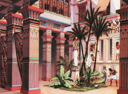 Храмы обычно строили в виде огромных прямоугольных зданий. Их возводили на каменных террасах и окружали высокими стенами. В стене оставляли узкий проход, пройдя через который можно было попасть во внутренний двор, украшенный колоннами. Им придавали сходство со связками стеблей папируса или стволами пальм, увенчанных цветами. Проходя между колоннами, можно было подумать, что идешь сквозь чащу каменных деревьев. Лишь миновав этот сказочный каменный лес, человек попадал в сам храм.