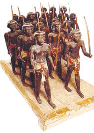 Чтобы отражать набеги соседей и держать в повиновении население собственной страны, фараонам была необходима сильная армия. Средств на ее вооружение и содержание они не жалели. Основу войска составляли пехотинцы. Их набирали из простых египтян – по одному человеку от сотни дворов. Сильных и ловких юношей обучали стрелять из лука, метать копье, сражаться на мечах, нападать на врага дружно, в едином строю. Из них выходили закаленные бойцы, беспрекословно выполнявшие приказания военачальников и преданные фараону.