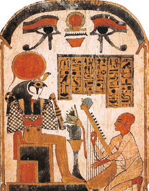 Музыкант восхваляет бога Ра. Древнеегипетский рисунок