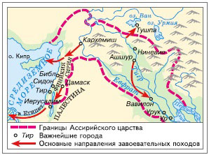 Пользуясь картой, расскажите о расширении территории Ассирийского царства.