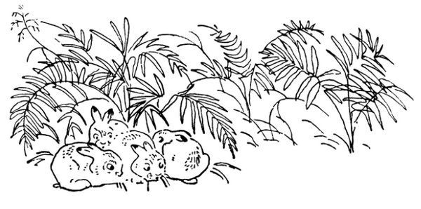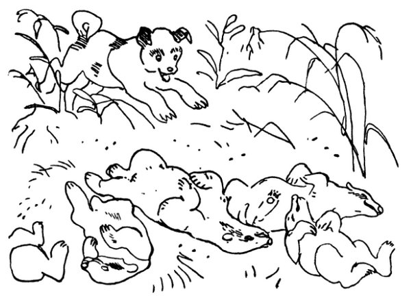 И тогда из травы один за другим стали выскакивать зайчата. Лисица не почуяла их, потому что они, как требует заячья наука, лежали неподвижно, прижав предательские пятки к земле.