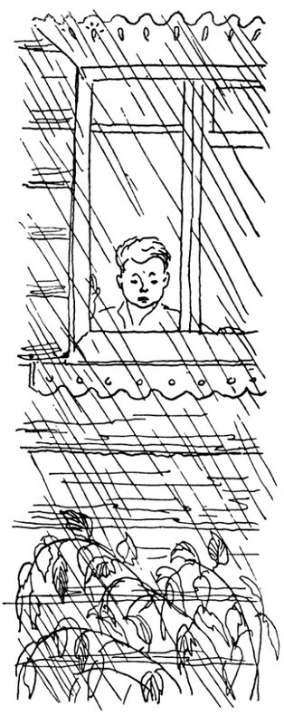Бабушка обещала скоро вернуться, но разразилась гроза. От ударов грома звенели стекла, дребезжала в буфете посуда. Вите было тоскливо и одиноко.