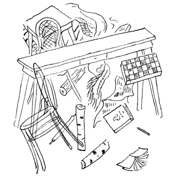 Выбросив белый фонтан опилок, рассыпался стол, развалился шкаф, стулья, брыкаясь, как жеребята, стали выпрыгивать в окно.