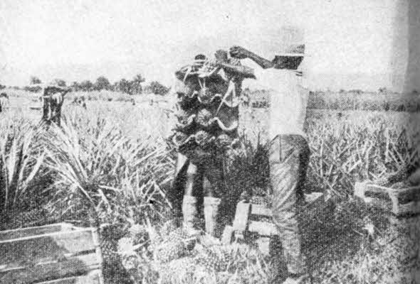 Шел сбор ананасов, и мы могли видеть, как рабочие сносят их к назначенному пункту, пользуясь для этого специальными, так сказать «вертикальными», носилками из плотной ткани, прикрепленной к деревянным палкам. Такие носилки рабочие надевают на спину и складывают ананасы в карманы, нашитые на ткани носилок в четыре ряда, по три кармана в каждом. Используя такие носилки, рабочий может одновременно унести на спине двенадцать ананасов, не повредив и не помяв их.