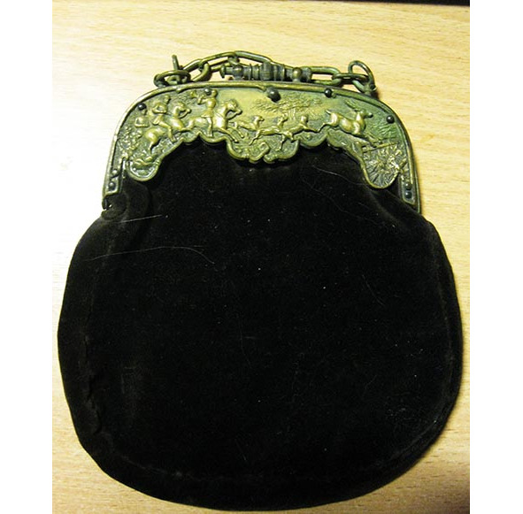 Такие сумочки с застежкой из золоченой бронзы являлись обычным аксессуаром женского костюма для верховой езды. Сумочка подвешивалась в пышные складки юбки и служила для хранения небольших предметов.