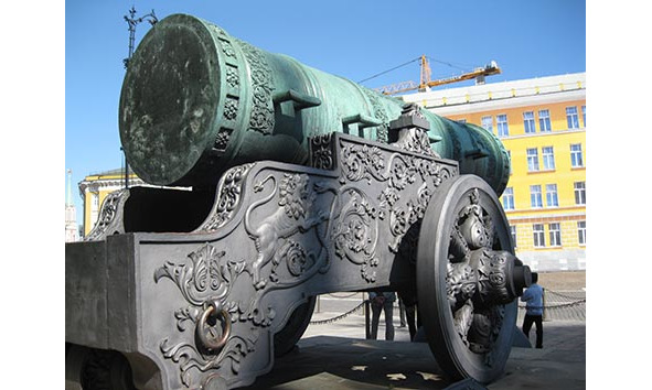 Царь-пушка, к которой нас отсылал код бенедектинского монаха, представляет собой громадный металлический цилиндр, длиной 5,34 метра и весом почти 40 тонн. Нарядный лафет, который, собственно, и придает этому бронзовому стакану вид привычной нам пушки, отлит на 250 лет позже. (Пушка – в 1586 году по замыслу Бориса Годунова, который был в то время соправителем царя Федора Иоанновича, а лафет – в 1836 году по указу Николая I).