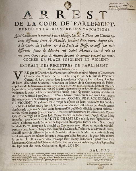 Постановление Парижского парламента, приговорившего кучера Пьера Анри к публичному наказанию: Анри был закован в железный ошейник и выставлен на площади Круа-дю-Трауар