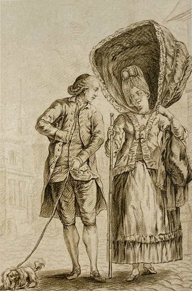 На прогулке: женщина и аббат с собачкой на поводке. Гравюра Л. М. Бонне по рисунку Ф. Буше. XVIII в.