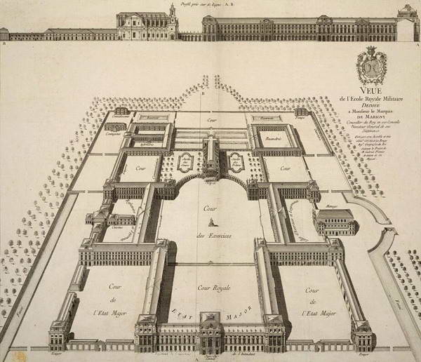 Идею военного училища для юношей из обедневших дворянских семей предложил королю сам Пари-Дюверне. Эдикт об учреждении Военной школы был подписан в 1751 г., и ее строительство стало самым грандиозным предприятием царствования Людовика XV. Местом для строительства была выбрана равнина Гренель на левом берегу Сены. Король поручил проект архитектору Анжу Жаку Габриелю (после его смерти в 1782 г. работу завершали Этьен Луи Булле и Александр Теодор Броньяр), который расположил Военную школу на оси, перпендикулярной руслу Сены. Комплекс, рассчитанный на 500 учащихся и 200 человек персонала и включавший в себя учебные и жилые корпуса, часовню, кухню, лазарет, прачечную, склады, конюшни, манежи и проч., по площади должен был намного превосходить ансамбль Дома Инвалидов. Однако из-за нехватки средств масштабы постройки оказались вдвое меньше намеченных, оформление получилось более скупым, а главный вход был устроен не со стороны реки, а на южном фасаде здания. Тем не менее импозантный северный фасад центрального корпуса и сегодня остается важным градообразующим элементом. Габриель украсил его портиком с восемью колоннами под большим фронтоном, над которым высятся фигуры Победы, Франции, Силы и Мира. В 1770 г. перед главным входом была разбита площадь Фонтенуа и проложена авеню Ловендаль, связавшая Школу с Домом Инвалидов. С остальных трех сторон здание опоясали авеню Сюффрен, Ла Бурдонне и Ла Мотт-Пике. С северной стороны до самой Сены растянулось Марсово поле – широкая эспланада, где маршировали и обучались выездке ученики Школы и полк французской гвардии. Школа открыла свои двери в 1760 г., а с 1778 г. здесь начала действовать Военная академия. 22 октября 1784 г. ее порог впервые переступил 15-летний Наполеон Бонапарт.