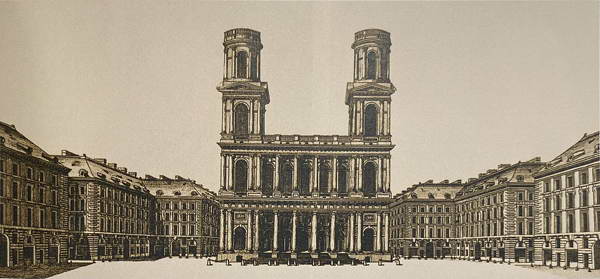 Церковь и площадь Сен-Сюльпис (Св. Сульпиция). Гравюра Ж. Л. Ле Ружа по рисунку Д. Н. Сервандони с переделками Ж. Ф. Шальгрена. 1781 г.