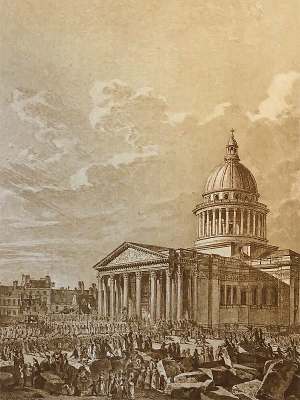 В 1791 г. по решению Законодательного собрания церковь Св. Женевьевы стала Пантеоном великих людей Франции. Первым там был похоронен Мирабо, в том же 1791 г. туда был перенесен прах Вольтера, а в 1794 г. – Руссо.