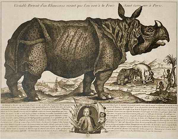 Настоящий портрет живого носорога, показанного на Сен-Жерменской ярмарке. Эстамп с гравюры Э. Шарпантье. 1749 г.