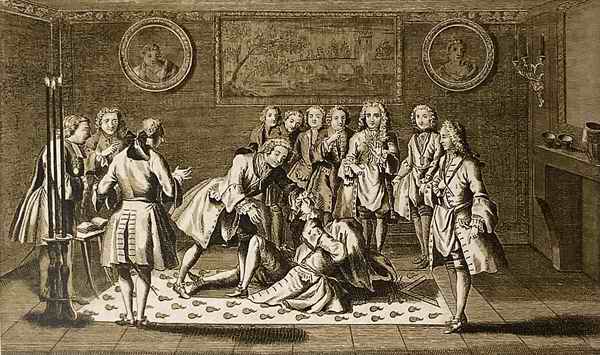 Масонская ассамблея. Обряд посвящения в мастера ложи. Эстамп XVIII в. Великий мастер подает принимаемому руку, помогая «восстать из гроба», и сообщает ему тайное слово