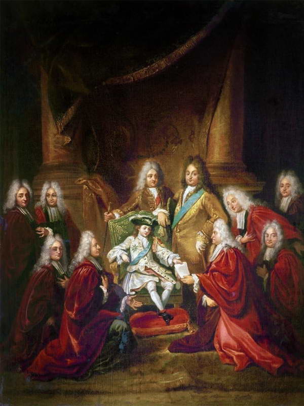 Малолетний Людовик XV вручает парижским эшевенам аноблирующие патенты. Художник Л. де Булонь Младший (?). Около 1716 г.