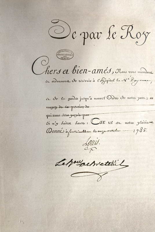 Королевский указ о заключении под стражу, подписанный Людовиком XVI и завизированный министром Королевского дома бароном де Бретёем. В бланк указа достаточно было вписать место заключения и имя узника. 1785 г.