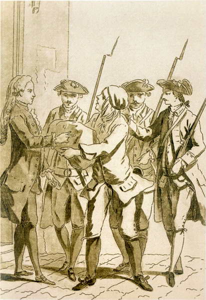 Жанно перед полицейским комиссаром. Эстамп Л. М. Бонне. 1779 г.